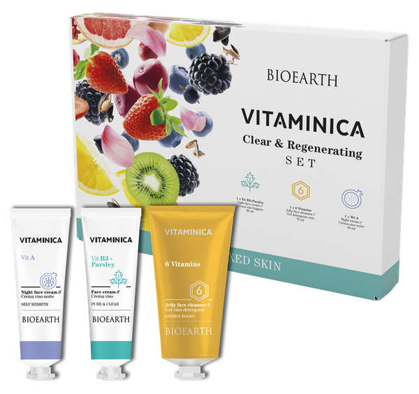 Beauty routine viso vegan ricca in Vitamine ed estratti botanici sinergici, anche loro fonti o da agricoltura biologica, ideale per la detersione e il trattamento di pelli miste ed impure.