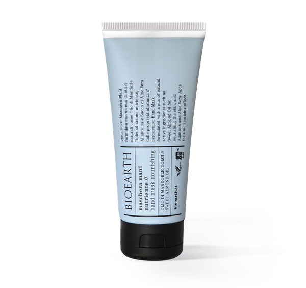Maschera Mani formulata con un mix di attivi naturali come Olio di Mandorle Dolci ad azione nutriente, Allantoina e Succo di Aloe Vera dalle proprietà idratanti.
