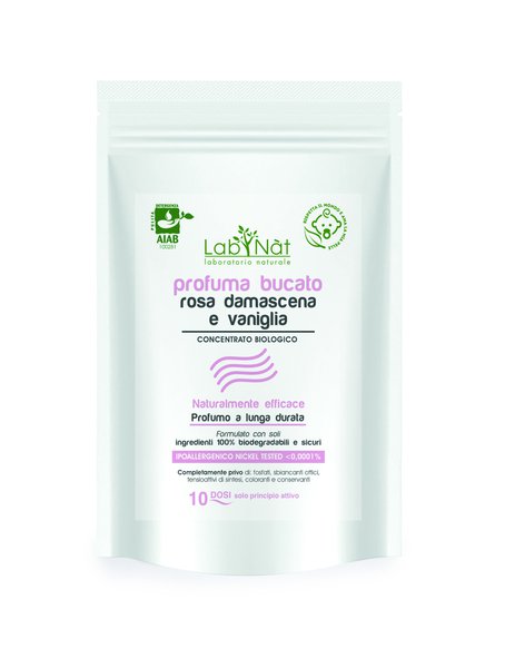 L’incontro tra la Rosa Damascena e i baccelli di Vaniglia, dona al bucato un avvolgente profumo di pulito per molto tempo.
